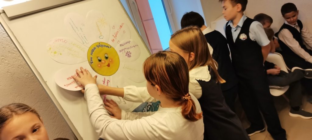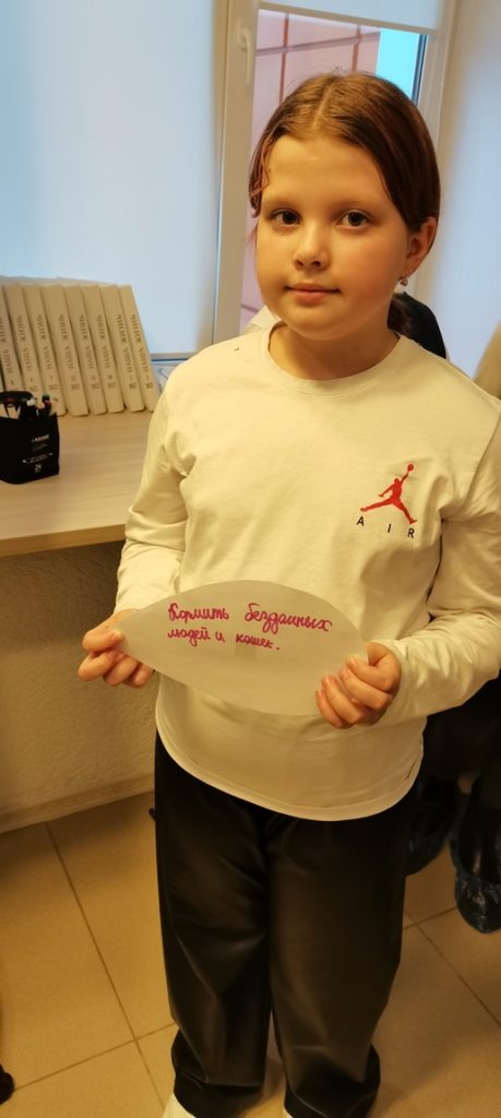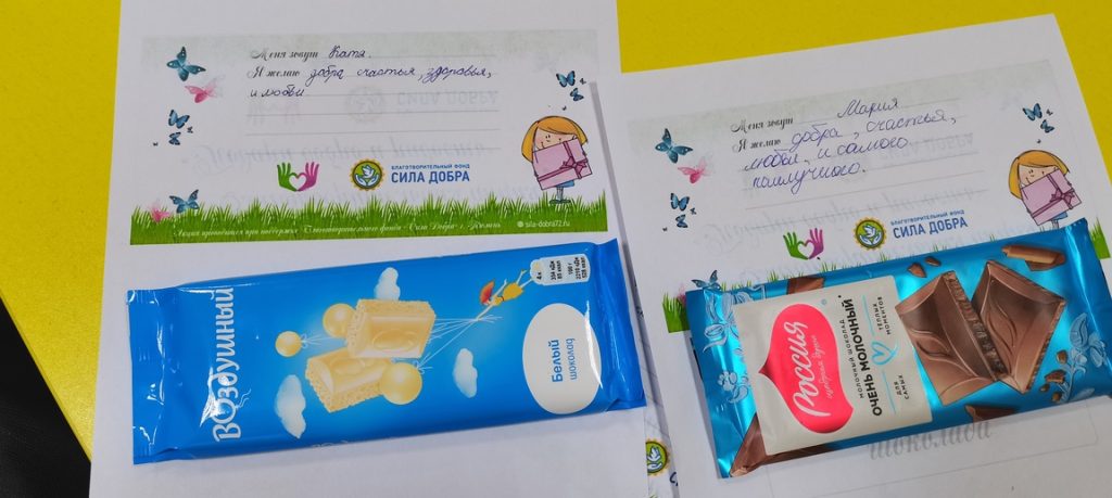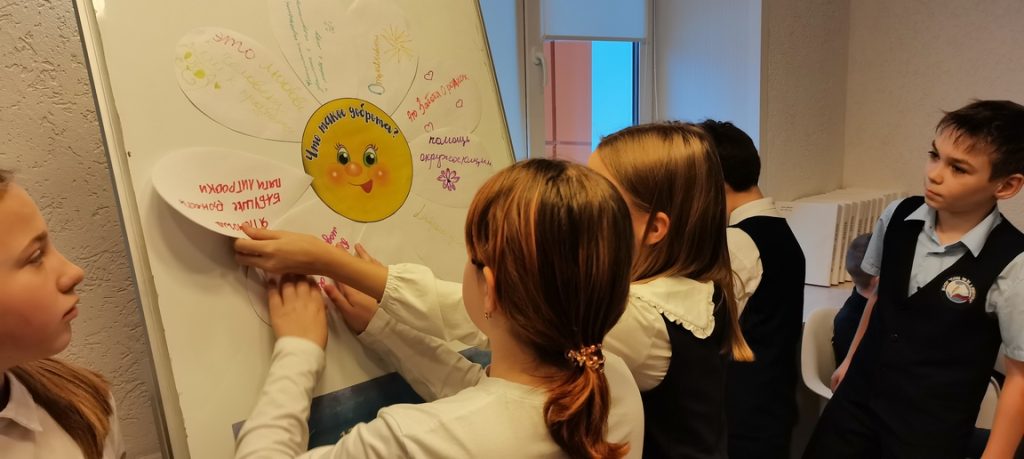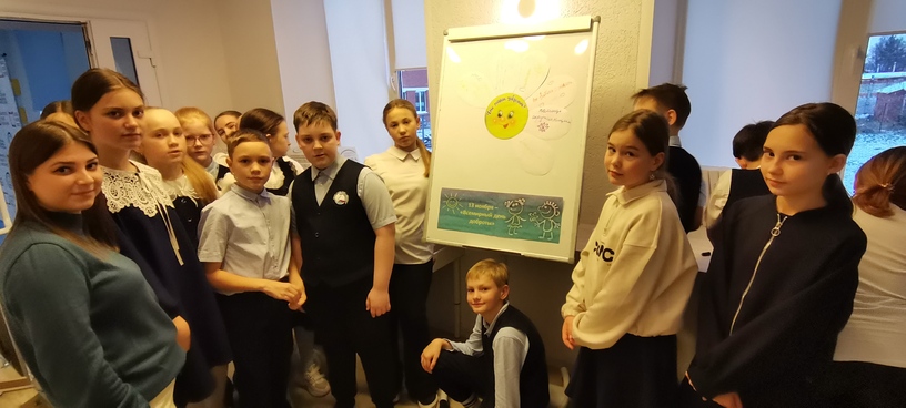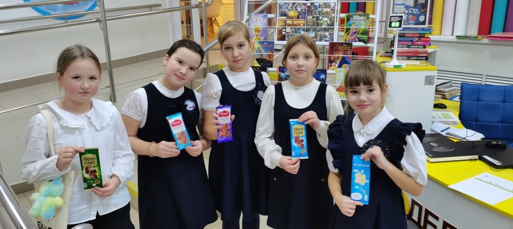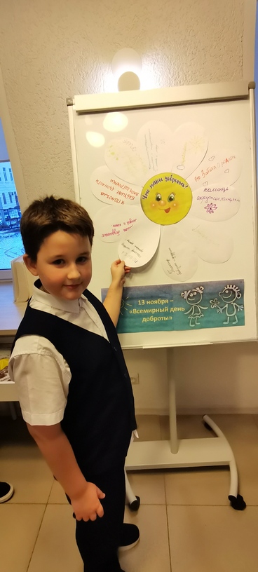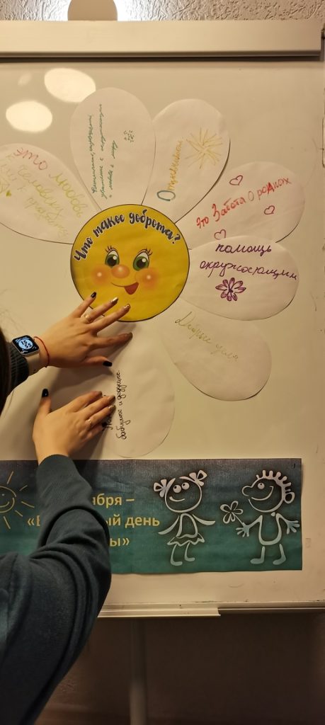 Ребята 4 А класса обсудили, что для каждого из них значит «доброта». Ребята записали свои мысли на лепестках и разместили на ромашку, а также приняли участие в благотворительной акции «Подари добро и радость», посвященную дню инвалидов. Суть акции состоит в том, что в любую библиотеку нашего города читатели приносят плитку шоколада и на открытке пишут свои пожелания, а сотрудники библиотеки передают эти сладкие пожелания читателям-инвалидам.