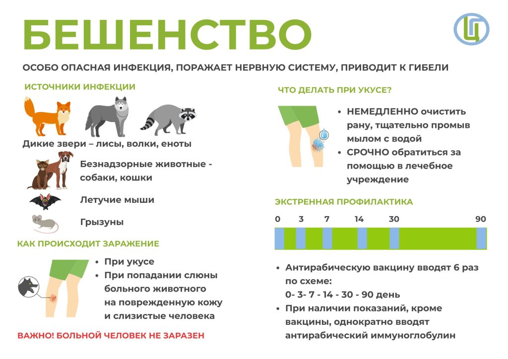 Только своевременно введенная антирабическая вакцина спасает от развития бешенства у человека. Чем раньше будет начат курс антирабических прививок, тем быстрее произойдет выработка иммунитета, который позволит предотвратить развитие заболевания. Лекарств от бешенства в настоящее время не существует! Прививки против бешенства проводятся бесплатно, независимо от наличия полиса обязательного медицинского страхования. Вакцину вводят в день обращения, а затем на 3, 7, 14, 30, 90 дни после укуса; вакцина вводится в дозе 1,0 мл, в мышцу плеча. Во время лечения категорически запрещено употреблять алкоголь.